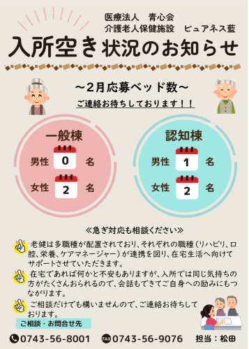 入所空き状況(2月) タグ:スマートフォン対応 ピュアネス藍 作成 2026-01-27 ピュアネス藍は、入所の他にショートステイ、デイケア(通所リハビリ)、訪問リハビリなどのサービスがございます。 ご本人様やご家族様の中には「いきなり入所は・・・」という方もたくさんおられます。 そんな方は、まず、デイケア(通所)やショートステイからご利用される方も多いです。 老健は在宅復帰が目標のため、リハビリがついています。一時入所してリハビリで元気になって在宅生活維持しませんか? ご相談お待ちしております。