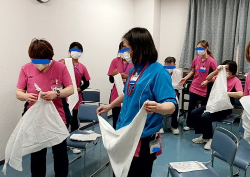 職員研修会 タグ:スマートフォン対応 ピュアネス藍 作成 2026-02-26 介護施設には事業継続計画(BCP)といって、災害など緊急事態が発生したときに備えて、日頃から研修・訓練が義務付けられています。 今回、その一環として職員研修を行いました。 内容は三角巾による止血訓練を行いました。普段、看護師が居るのである程度の対応はお願いするのですが、介護士としてもある程度応急処置として覚えておくべきことなので訓練を行いました。 利用者様が安全に過ごしていただくよう、研修を重ねていきます。